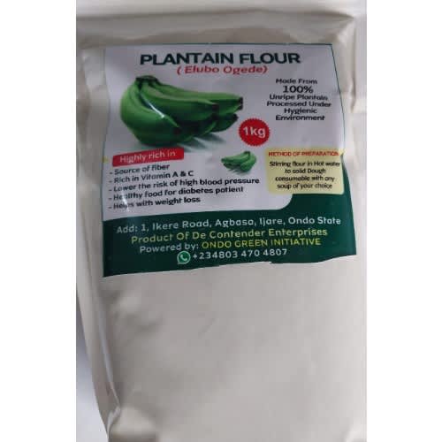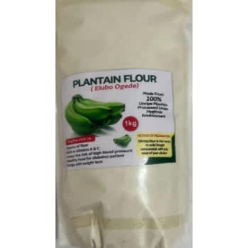 Plantain Flour (Elubo Ogede) Made from unripe plantain processed under hygienic environment.Highly rich in source of fiberrich in vitamins A & Chelps in weight losslower the risk of high blood pressureHealthy food for diabet.
