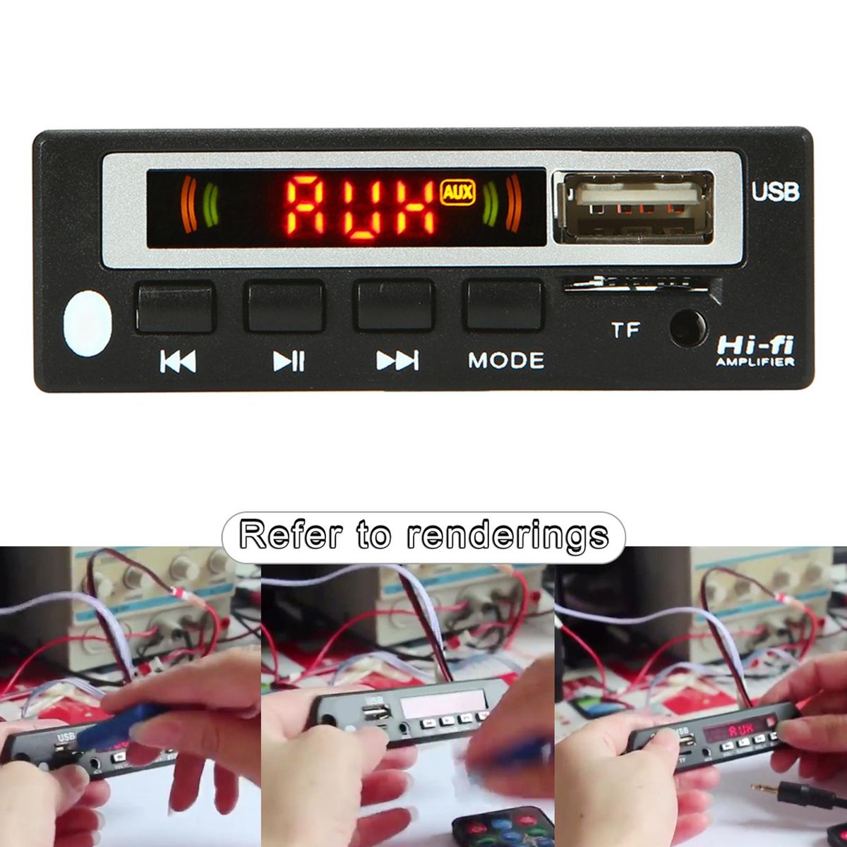 Material: ABS PlasticDual decoding Support music in MP3/WMA/WAV formatSupport bluetooth functionWith digital tube displaySupport MMC/TF/MMA and other cards, support USB interface (U disk)Power-off memory function 24C02Bluetooth version: Bluetooth 5.0Bluetooth receiving distance: within 15 meters