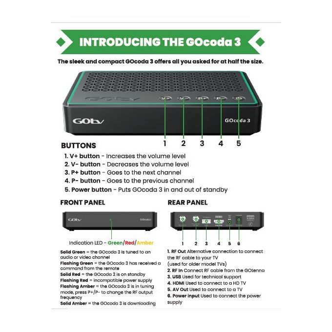 1. GOTV GOcoda 3 Decoder Main Unit - 1 2. Gotenna Complete Antenna + 10M RF cable -1 3. 12V Power Supply -1 4. GOTV remote -1 5. AAA Remote battery -2 6. 3 Pin AV cable -1 set -1