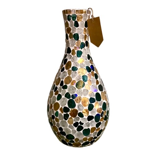 It is a perfect accent for living rooms, hallways, entryways, bedrooms and shelving and can be used to display dried flowers, leaves and decorative feathers. It is also an elegant and eye-catching piece when used alone. The shape and color enhances any surface where a touch of sophistication is desired. The shimmering surface adds charm to this welcome gift for any celebration. The hand-placed glass mosaic tiles sparkle when touched by natural or artificial light. This vase is durable and is sure to enhance your home for many years regardless of where it is displayed. It is handcrafted by artisans and their attention to detail is evident in the meticulously placed glass tiles covering the surface. Decor Shore s a wide range of unique and inspiring home and office decor. Each piece is hand-made and distinctive giving your home or office unequalled charm.