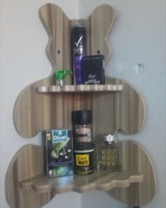 This decorative functional wall-mounted space-saving handmade teddy bear-shaped 2-tier designer corner shelf is a combination of aesthetics, taste and functionality artistically handcrafted to add beauty and a touch of class to your living room, bedroom, and any other part of your beautiful house. It saves you space while helping you get your cool items better organized. It is neatly and easily mounted up on the wall at angle 90 degrees corner.