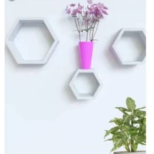 FLOATING SHELF For Home And Office. This hexagon shelf unit is the ultimate stylish yet functional piece for your living room space, office space as well as bedroom. it gives a surprising amount of space for storing books, pictures and other decorative items. plus it just looks really cool. made mid century modern style, with clean lines and an interesting geometric shape, it transforms your room just by being there, (arrange according to your choice) this hexagon shape shelves is to display, decorate, flower vases and other household item for decoration
