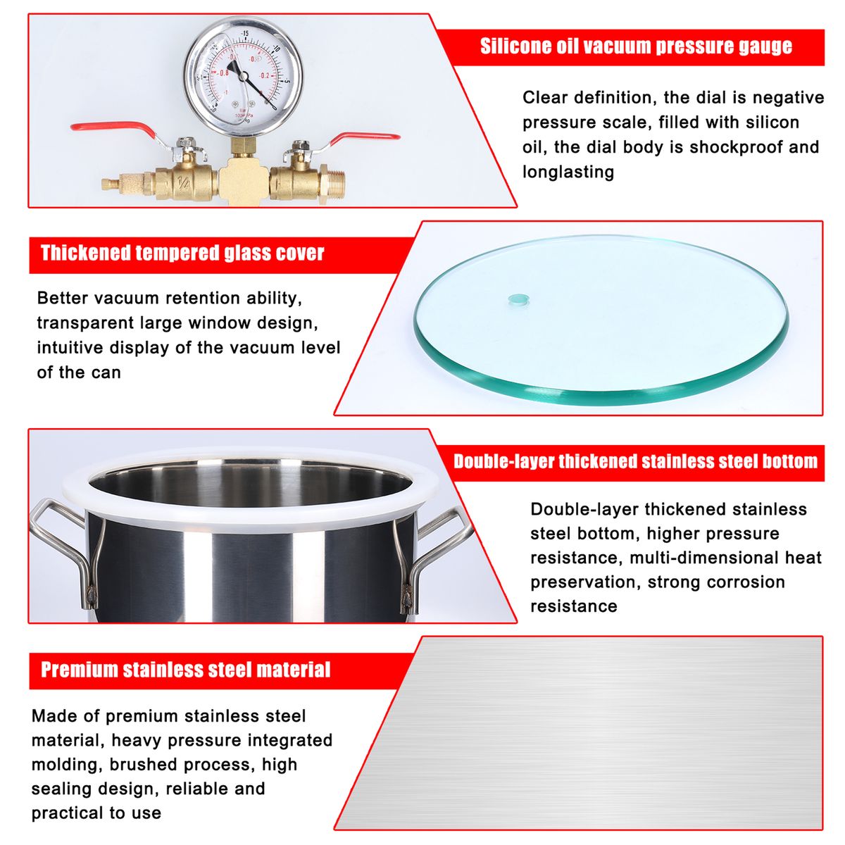 Thickened tempered cover, better vacuum retention ability, transparent large window design, intuitive display of the vacuum level of the can.