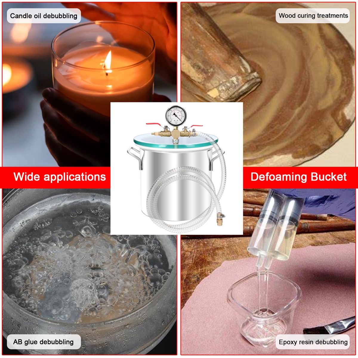 Wide applications, suitable for a variety of scenarios, candle oil debubbling, wood curing treatments, AB glue debubbling, polyurethane type debubbling, epoxy resin debubbling, silicone debubbling and etc..