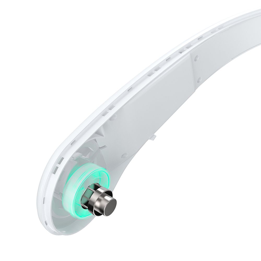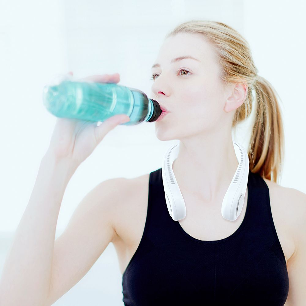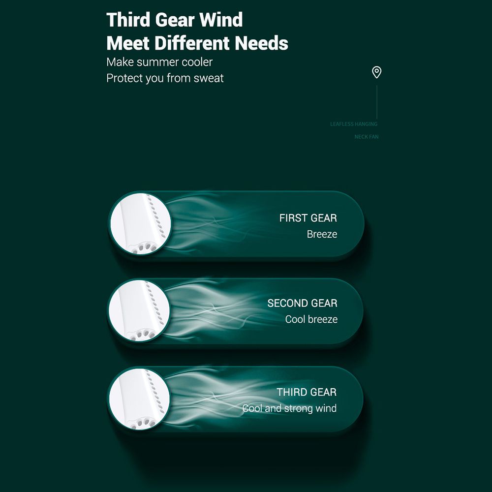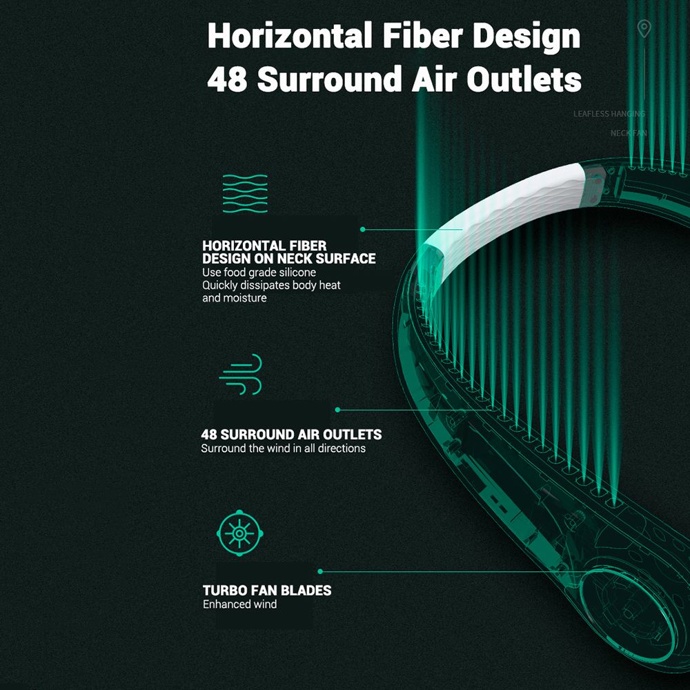 The hanging neck fan have 3 speed adjustment, wind machine on both sides, 48 surround air outlets, comfortable to blowing. Use food grade silica , quick dissipates body heat and moisture. All rubber tough arm, can be used in any angle, skin-friendly fit is not easy to break.