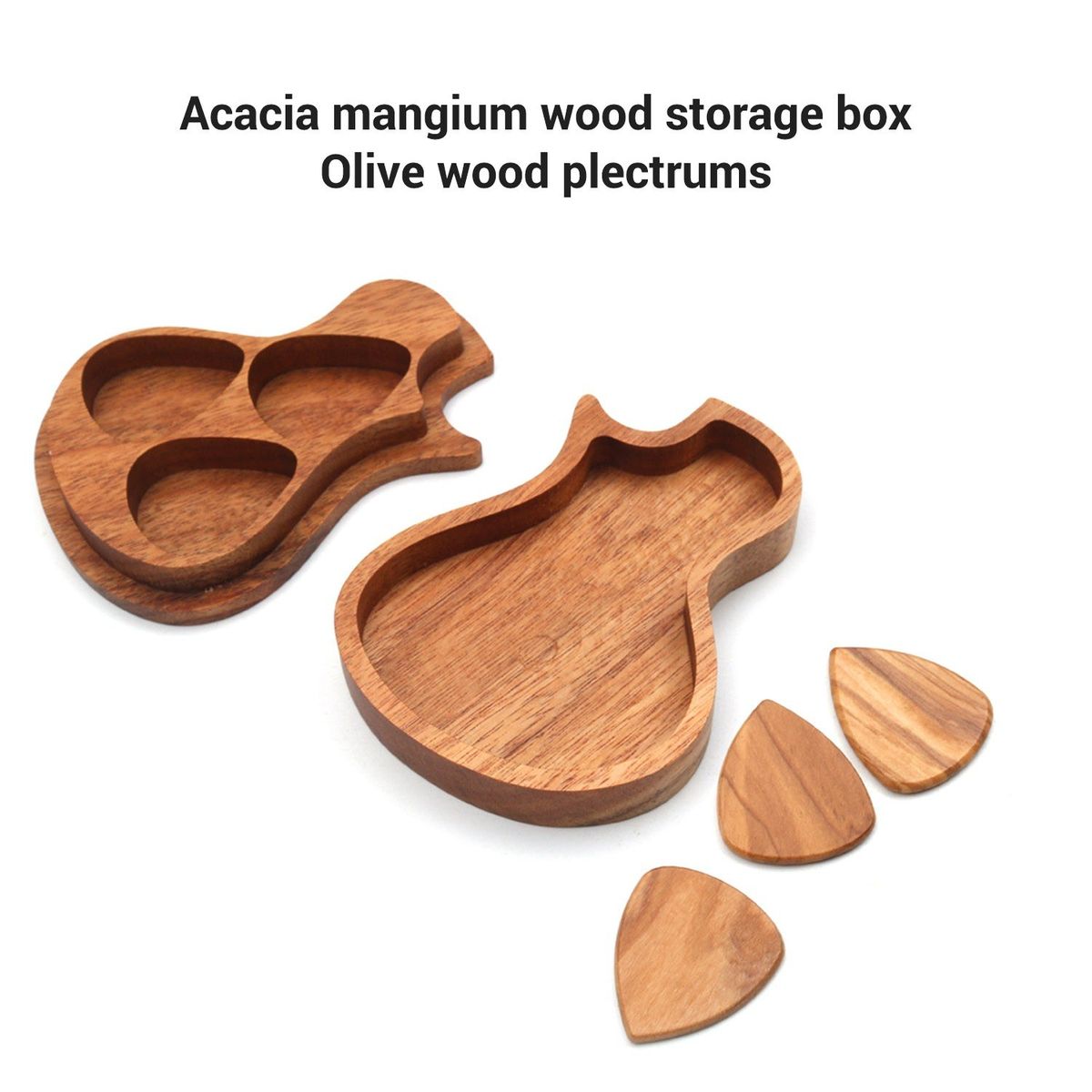 The storage box is made of acacia mangium wood and the guitar plectrums are made of olive wood, featuring fine sturdiness, long service life.