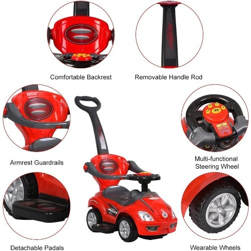 Funny and Safe: Come with musical buttons on the steering wheel, amuse kids easily. Also, there are removable guardrails available, protect your little one from falling off.
