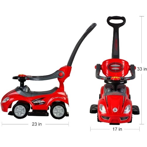 Brand New Factory Sealed 2015 Model Deluxe Mega Car 3 in 1 Little Cute Ride On Push Car with Handle and Sound for Toddlers. Our Little Cute Ride On Push Mega Car is a pushing car, which can also be used as a stroller to stroll around inside and/or outside the house, in a park, around the school play ground, in the mall, and any place you can think of. The child will be so happy with all the fun that s/he is strolling along with you, with even more fun is the horn from its steering wheel that s/he can play with. The handle can easily be attached to push this marvelous cute Mega Car while having his/her favorite toys to bring along with in the underneath compartment of seat storage. Our Mega Car is designed for baby's FIRST STEP to learn how to walk, while focusing on learning the different kinds of shapes and colors. Equally important is that it's made of "STRONG and DURABLE PLASTIC CONSTRUCTION" with its built-in adjustable armrest guardrails to provide safety for children. It's worry-free product as it does NOT require any battery. This Mega Car will make so much fun for both adults and children for many years to come. You must have to see it, feel it, have your child rides on it, in order to love it! It is "Simple and Easy" to Assemble and Adult Supervision are required. Also available in RED