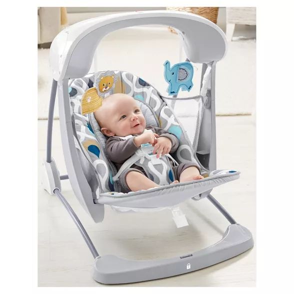 This convenient baby swing & stationary seat has everything to soothe your little one, at home or on the go. From the super soft seat pad and relaxing sway motions, to the calming vibrations, gentle music and sounds, and soft animal friends to bat at, your baby will love this cozy spot. And, the seat easily folds, so you can take it along wherever you and your baby go!