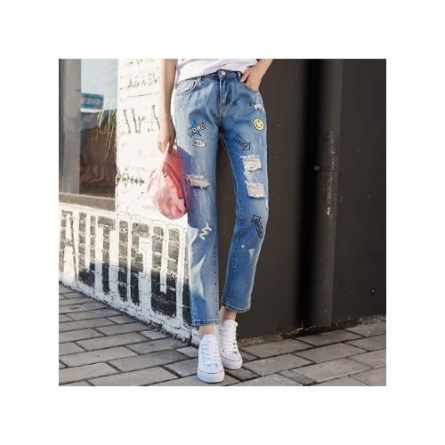 New Denim Women Ripped Jeans Women Girls Slim Blue Jeans Woman Elastic Novelty Print Holes