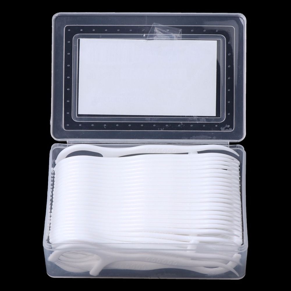 Item Name: Floss PicksQuantity: 1 Box: 50PcsMaterial: Plastic, Nylon LineFeatures: Strong Tension, Good Flexibility, Easy to UseFloss Pick Length: 7.5cm/2.95" (Approx.)Box Size: 8.1cm x 5.3cm x 2.4cm/3.19" x 2.09" x 0.94" (Approx.)