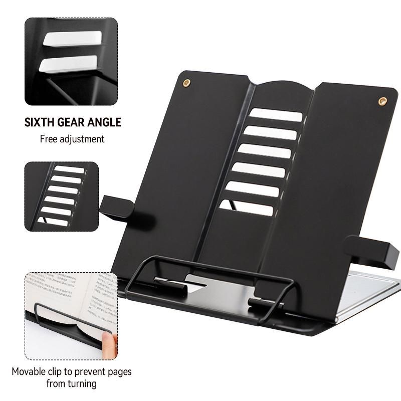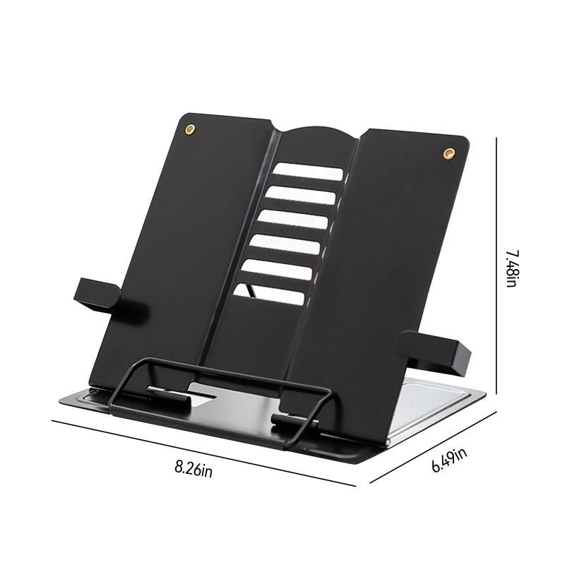 Our cookbook holder has 6 adjustable positions for you to choose from. The height and angle can be adjustable by the multiple notches on the backrest. Which could be helpful when you read books and need adjust the distance between your eyes and books, protect your neck, eyes and back.