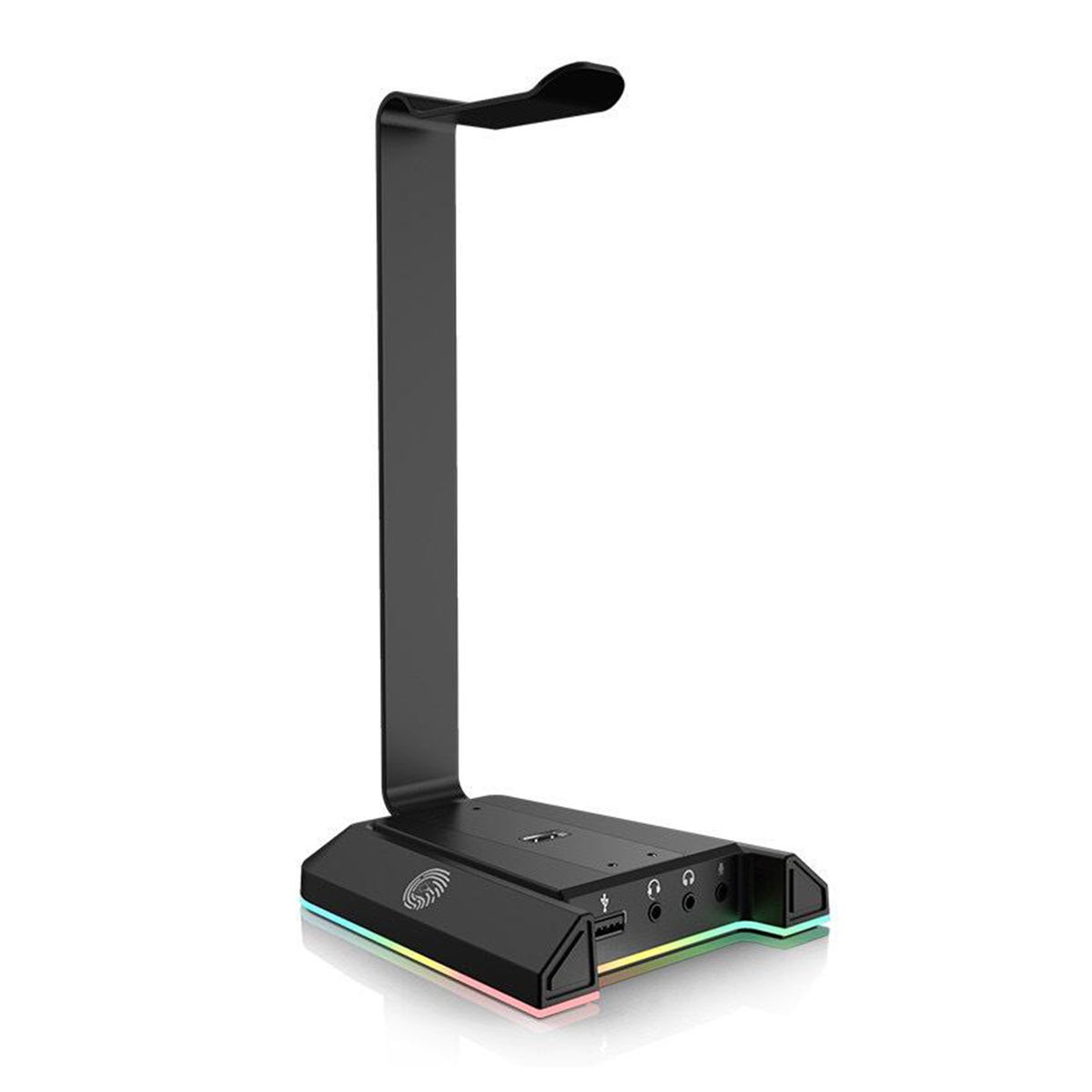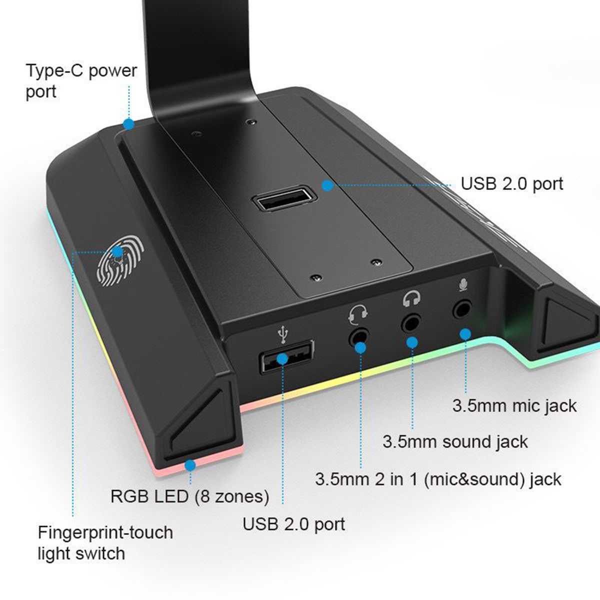7.1 SURROUND SOUND GAMING HEADSET STAND: this Gaming Headset Stand can deliver full range of 7.1 virtual surround sound when paired with headphones via USB ports or 3.5mm audio jacks, brings an immersive gaming experienceRGB GAMING HEADSET STAND: RGB Headset Stand Holder can provide 3 lighting modes, Multi-color Flowing mode, Multi-color Breathing mode and Static Lights Mode, to create a cool gaming atmosphere.Dynamic RGB Light can across 8 zones, allows different color options. Besides, you can easily change the light modes or turn off the light by touching the Fingerprint-touch Light Switch2 x USB PORTS & 3 x 3.5mm AUX PORTS: This Gaming Headphone Stand with 2 USB 2.0 ports for transferring data and files, like Windows, Linux, with plug & play function. No drivers required.Our RGB Headset Stand with Alumium alloy frame and non-slip ABS base provides great stability to safeguard your headset from wear-and-tear.