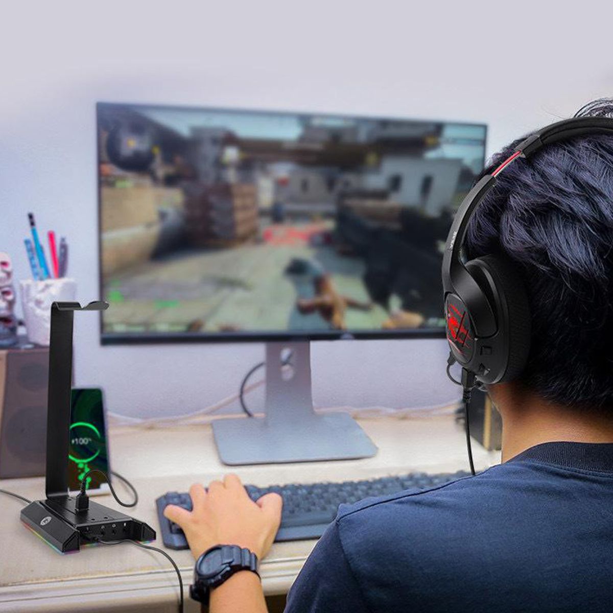 7.1 SURROUND SOUND GAMING HEADSET STAND: this Gaming Headset Stand can deliver full range of 7.1 virtual surround sound when paired with headphones via USB ports or 3.5mm audio jacks, brings an immersive gaming experience