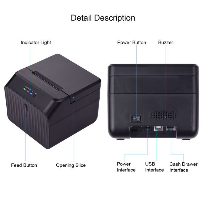 Note: The printer does not support POS card swiping function, it can be used with POS card swiping machine or cash register to print receipts.