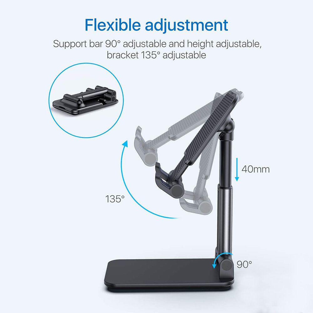 1. Foldable cell phone tablet holder2. Size: 10.5 * 11cm3. Angle adjustment range: 90 ° -135 °4. Height adjustment range: 650mm-105mm5. Color: black6. Material: PC / ABS + aluminum alloy base inside7. Style: foldable8. Durable and non-slip