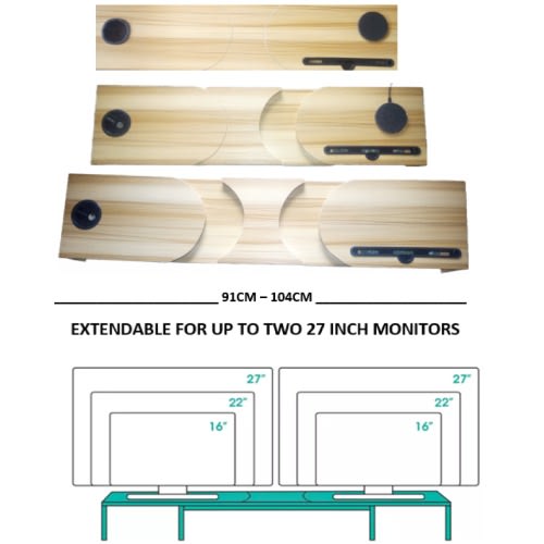 The ergonomic, expandable dual monitor riser stand comes with a universal 15W fast wireless phone charger (iPhones and Androids), a teacup holder, an iPad/phone slot and a stationery drawer.
