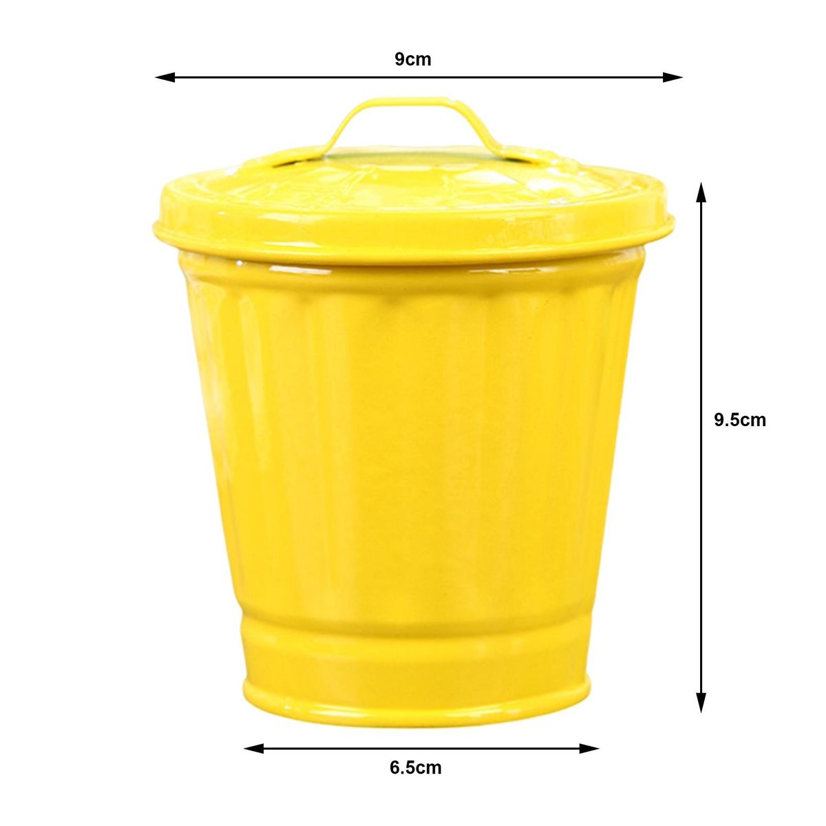 Top and bottom diameter id 9cm and 6.5cm. Height is 9.5cm.