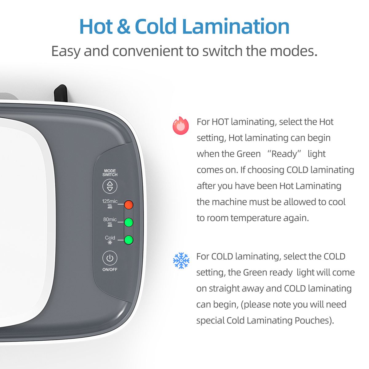 - HOT & COLD MODES: 2 laminating ways, thermal and cold laminating mode. They are perfect for different types of laminating pouches. Suitable for photos and documents. The minimum laminating thickness is 160 (2x80) microns and the maximum thickness is 250 (2x125) microns.