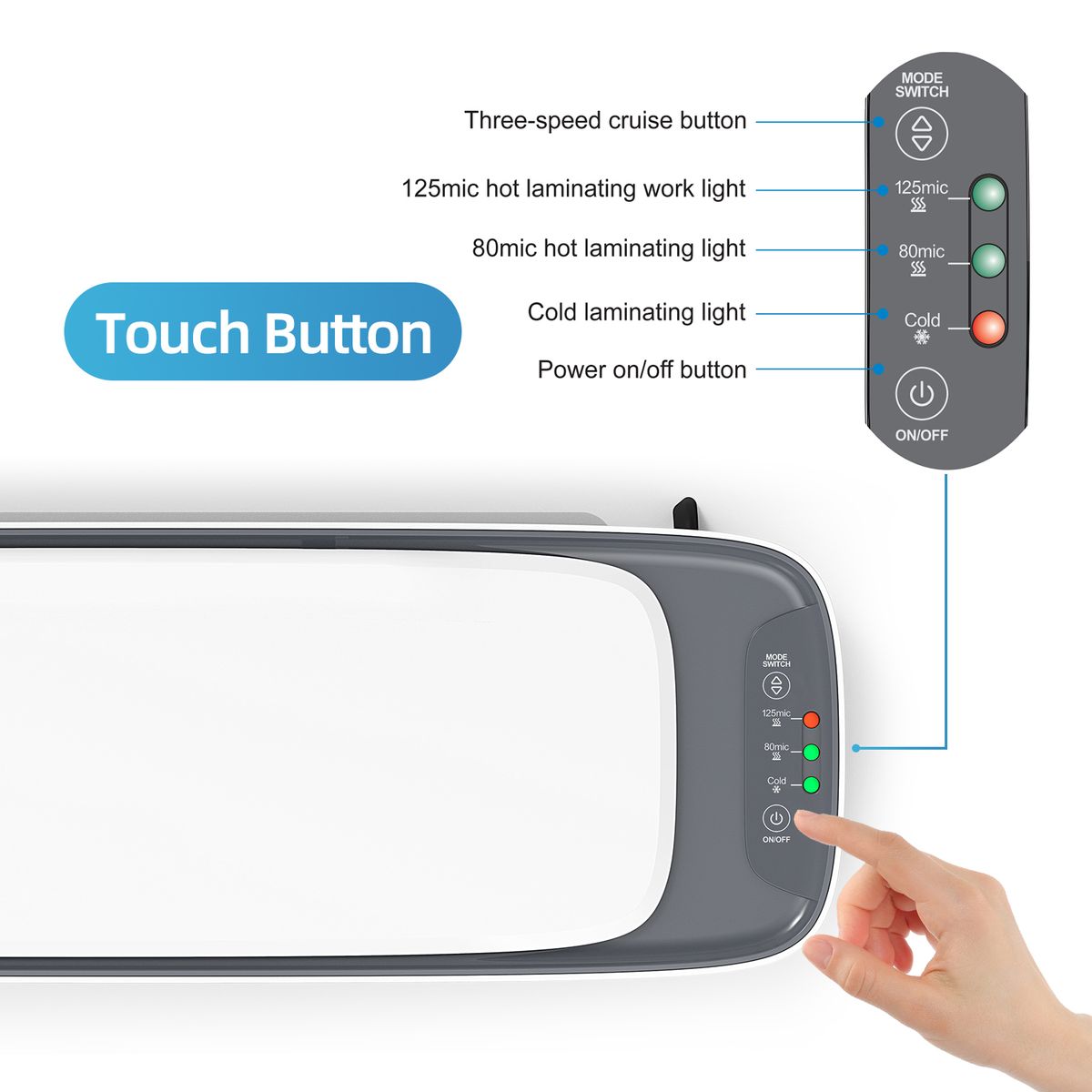 HOT & COLD MODES: 2 laminating ways, thermal and cold laminating mode. They are perfect for different types of laminating pouches. Suitable for photos and documents. The minimum laminating thickness is 160 (2x80) microns and the maximum thickness is 250 (2x125) microns.