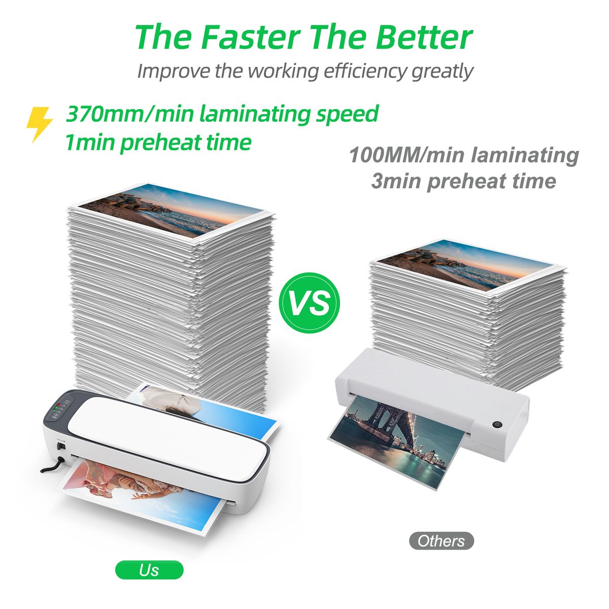 - FAST LAMINATING SPEED: With impressive 1 minute heat-up time, and up to 370mm/min laminating speed, faster than most of the laminator in the market, highly promote your working efficiency.