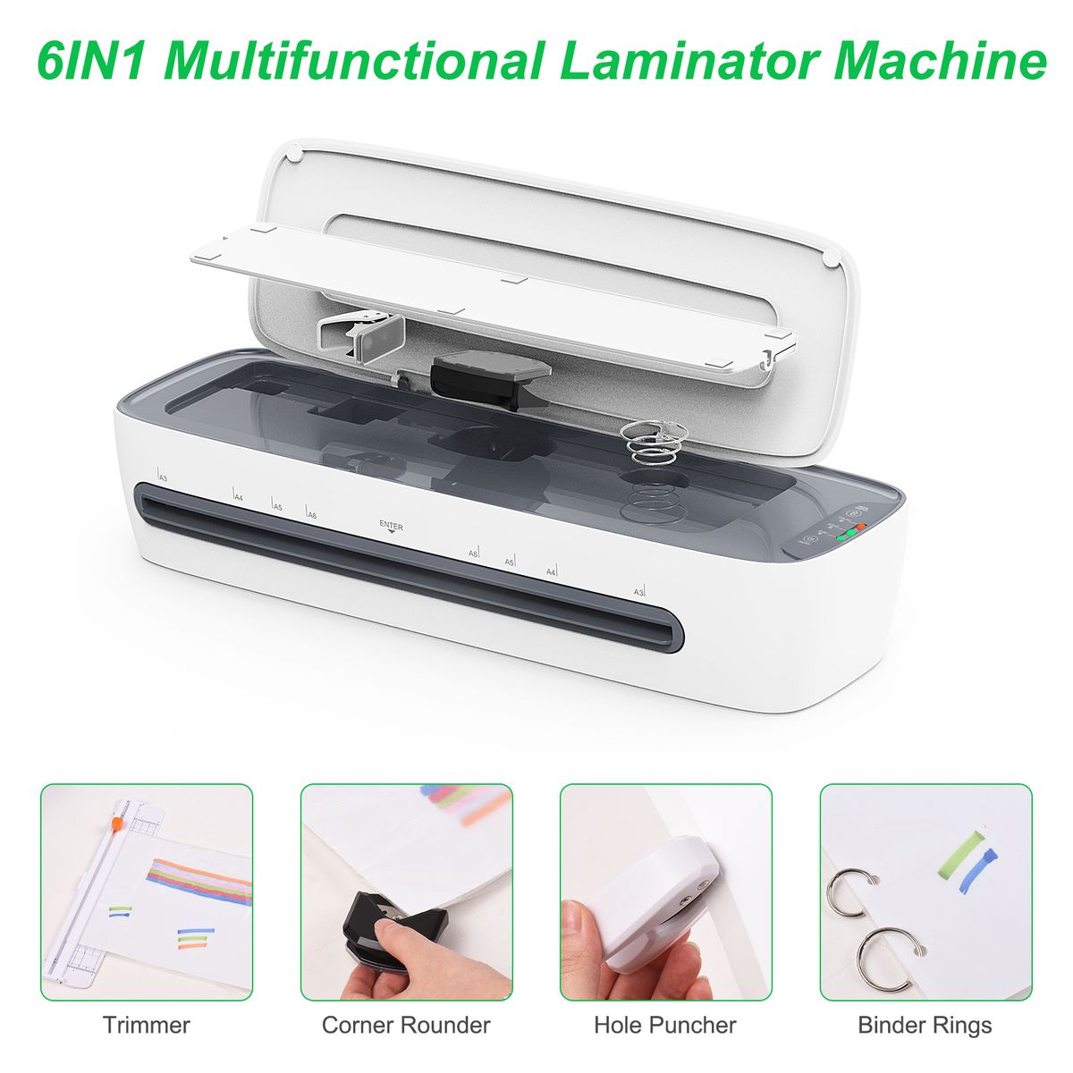 Features:- 6 in 1 MULTIFUNCTIONAL: SL688 laminator comes with 6 functions to meet your needs which including hot laminating and cold laminating, paper cutter, corner rounder, hole puncher and Hoop Binding, you can enjoy all convenience in this one laminator set. With 320mm/12.5 inches entry width, fit for A3/ A4/A5/A6 size paper which meets all your needs.