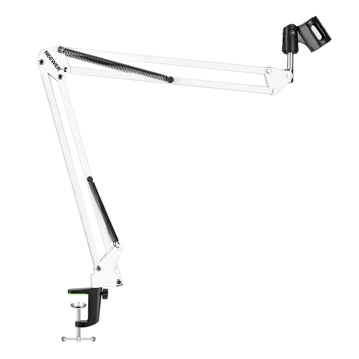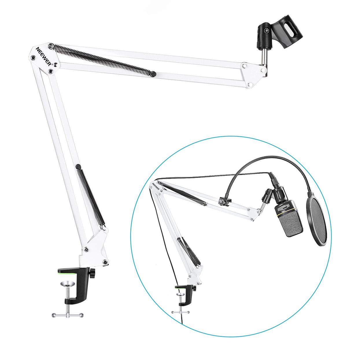 Kit includes: (1)White Mic Suspension Boom Scissor Arm Stand, (1)Table Mounting Clamp, (1)Mic Clip Holder, (1)Black Pop Filter