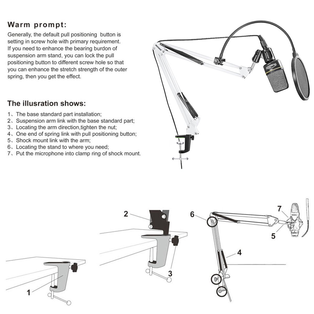 Mic Stand features solid steel construction and adjustable design; Can be easily adjusted to the suitable angle and height to show your perfect voice; Max load: Approx 3.31 pounds / 1.5 kilograms