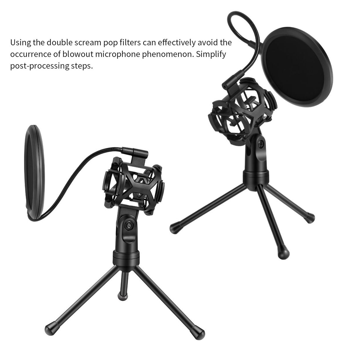 Desktop microphone stand with double scream filters make for a silent, clean and accurate signal. Sound is clear and bright.