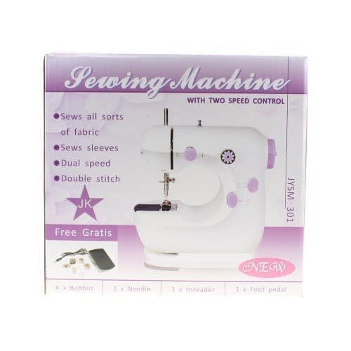 Includes: A mini sewing machine with four metallic bobbins, two needles (one already fitted), a foot pedal, a needle threader and an adapter