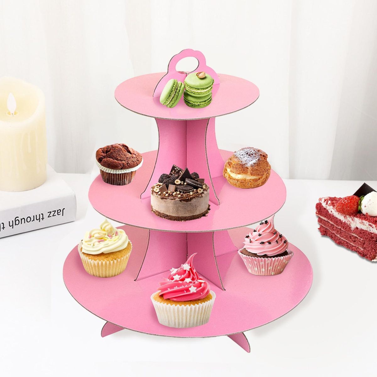 Made of the thick paper material is used to create a three-layer stable structure, making the cardboard cake stand more stable and more durable. The cupcake stand dessert plates are easy to be crooked after assembled, will stay and hold food firmly.