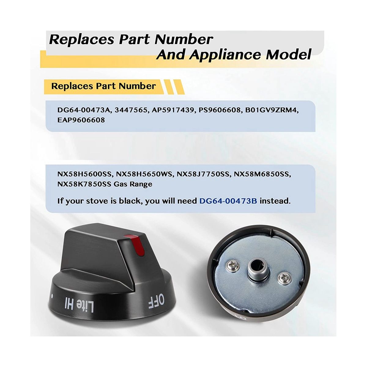 [stove knobs repments]Reps Part Number: DG64-00473A, DG64-00473B, 3447565, AP5917439, PS9606608, B01GV9ZRM4, EAP9606608. Fit for Samsung Range Oven NX58H5600SS, NX58H5650WS, NX58J7750SS, NX58M6850SS, NX58K7850SS Gas Range.