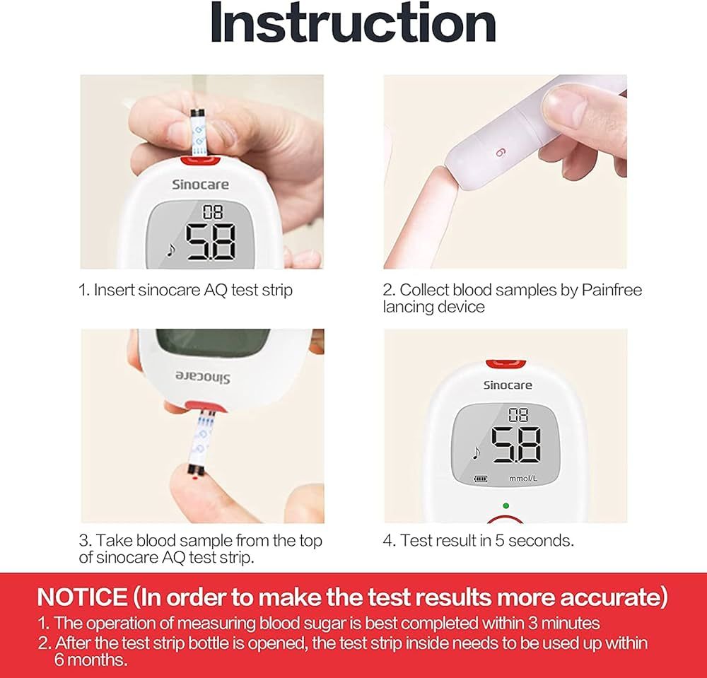 The Sinocare Safe AQ Voice Blood Glucose Meter Glucometer comes with 50 Lancets and 50 Test Stripscets Blood Sugar Testers for Diabetes.The Sinocare Safe AQ Smart diabetes test kit is all you need in one small package. The small, sleek design fits into the palm of your hand, making it extremely portable, so it can keep track of you wherever you go. Easy and precise testing to help you get precise and fast results in just 5 seconds. New modern design with a large screen for simpler, more discreet use.