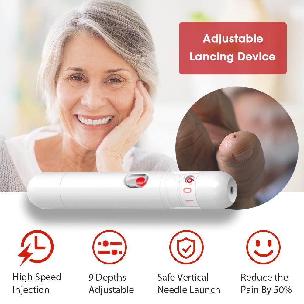 No coding, test strips only require a very small test to perform a blood glucose test - only 0.6 µl of blood.The removable lance device is small and easy to use, with one-hand priming. Fast launching, personalized 9-rated adjustable penetration depth settings. Practically painless lancing. Helps minimize skin damage.It avoids interference from blood oxygen variations.