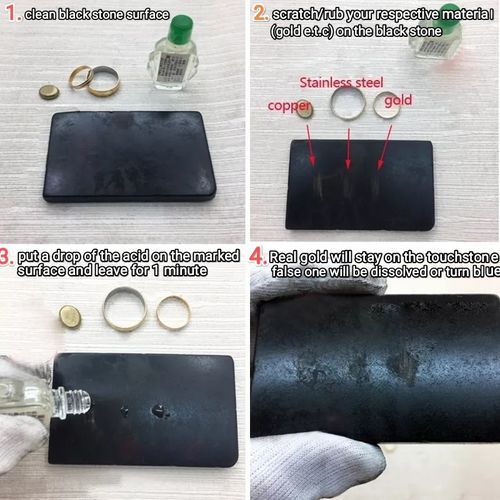 If you want test if your gold Jewelries is real or not, you just need to scratch it a little on the black stone leaving a small sample(colour mark) on stone, Then you Apply a drop acid (the Chemical in the transparent bottle) test on stone and leave for 1 minute. Real gold will stay on the touchstone, false one will be dissolved.