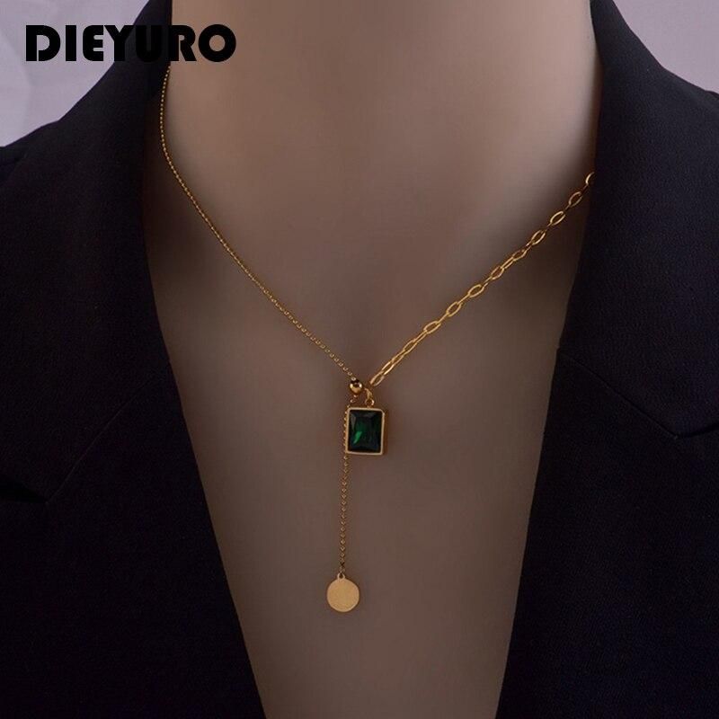 Buy DIEYURO 316L Stainless Steel Bead Drawstring Design Green Geometric Pendant Asymmetric Unique Design Chain Gold Woman Necklace in Nigeria