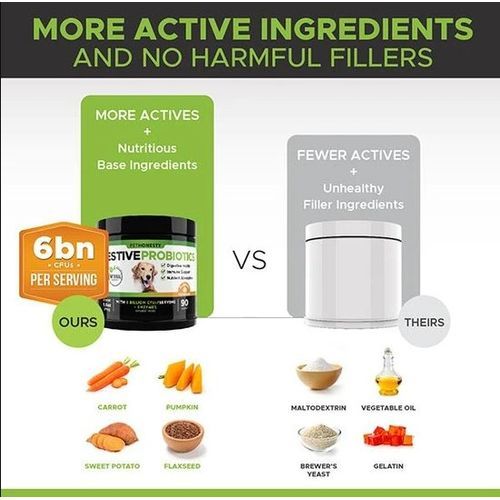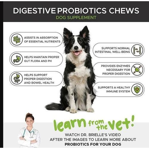 Adding a probiotic into a dog's diet will not only promote the growth of good bacteria, but it will also support healthy digestion of food and nutrient absorption. Our Digestive Probiotics supplement chews for dogs are not only delicious but they're beneficial to the overall health and well-being of your furry friend. Best of all, they're even safe for dogs with sensitive stomachs! Enhance your dog's health by adding good bacteria and digestive enzymes back into their system!