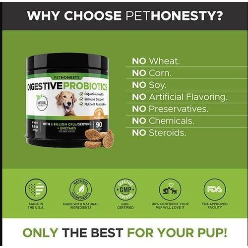 PetHonesty's Digestive Probiotics supplement for dogs are a delicious chew, loaded with benefits for your canine friend. Dogs' gastrointestinal tracts are very sensitive and can be easily upset due to your dog's diet causing them to struggle with digestive issues that make them irritable and uncomfortable. These delicious, vet-recommended Digestive Probiotics soft chews promote healthy digestion and intestinal health keeping them regular, happy and healthy.