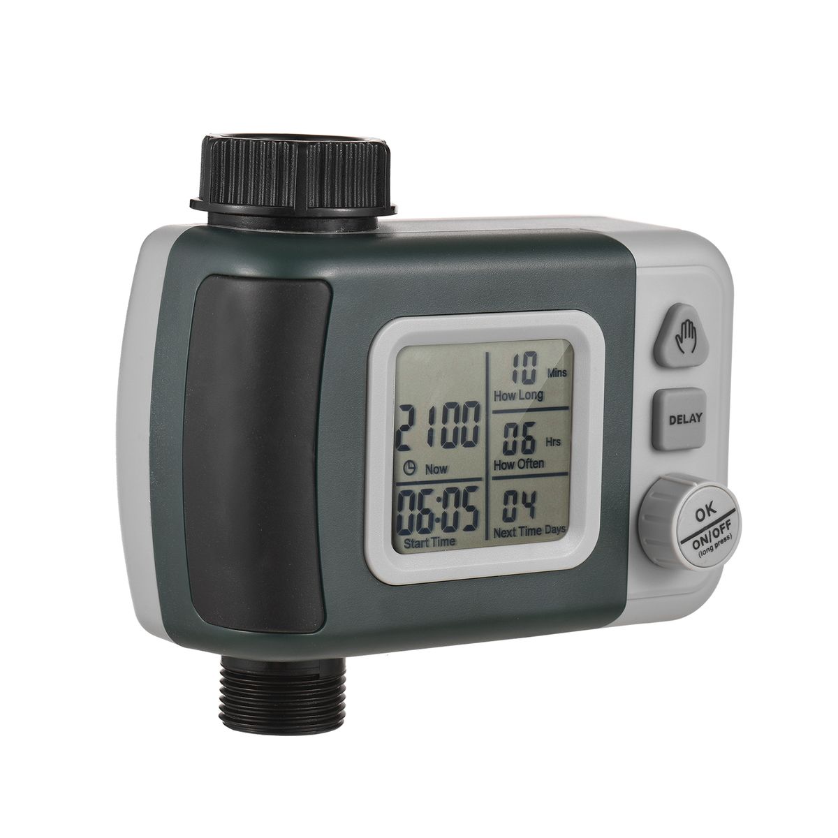 Programmed irrigation controller: set clock (hours and minutes), watering time, watering frequency and start time. It also supports rain delay function (manual operation) to save water-- irrigation will not be performed within the set time.