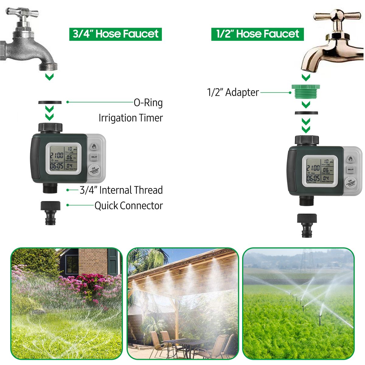 Intelligent water irrigation controller makes irrigation easier, more convenient and more efficient. Battery operated design and digital display screen make it easy to use. It's suitable for plant watering, agriculture irrigation, greenhouse humidification, dust removal, cooling the courtyard and more!