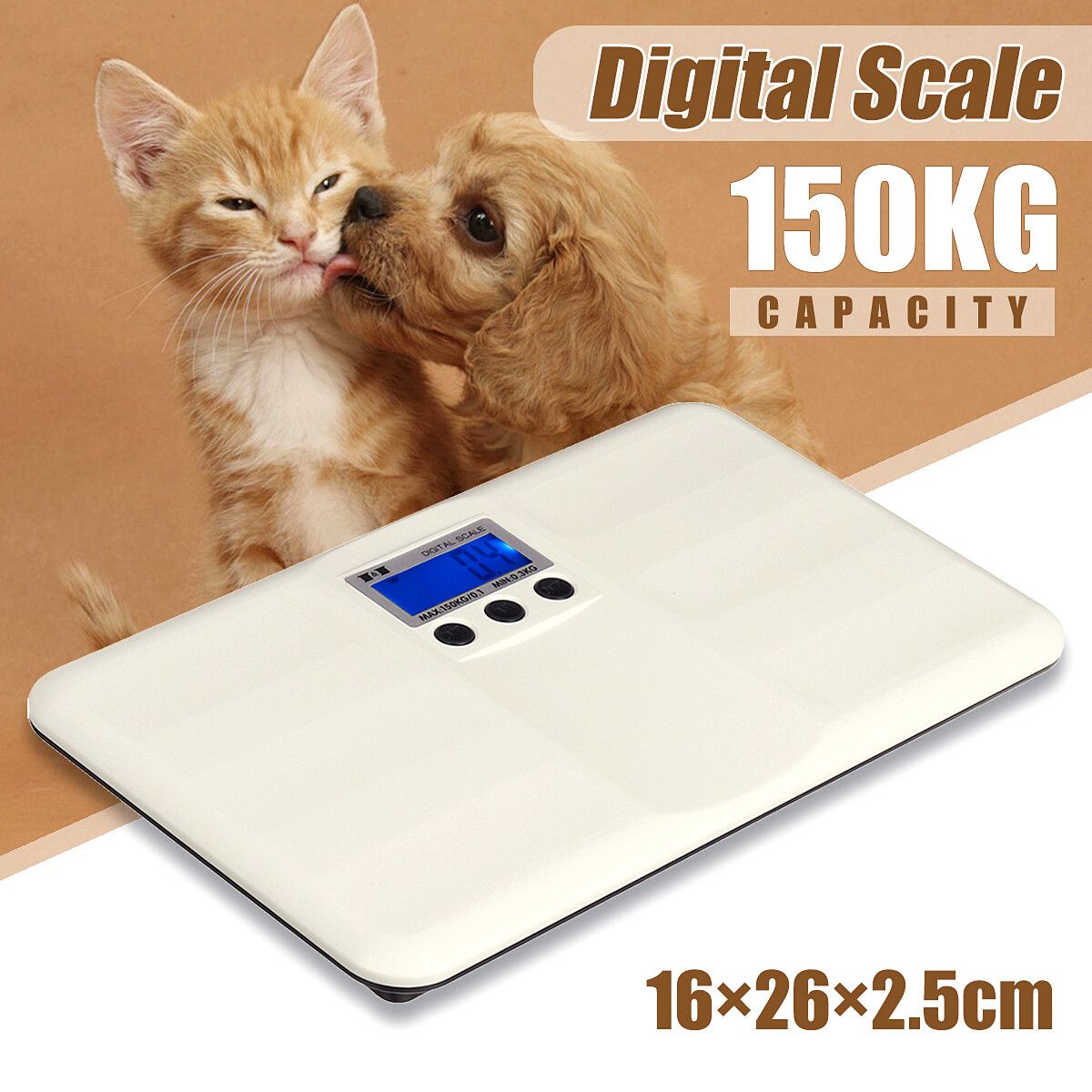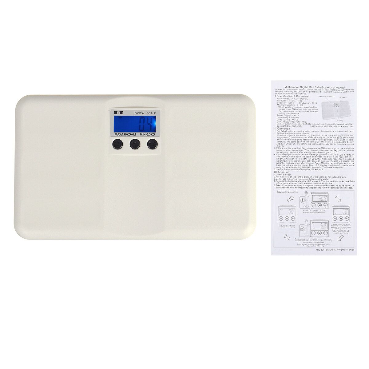 Weighing range: 0.3~150KG (When the object is<2kg, please press ON button; if it's>2kg, you can get the result directly when putting it on the scale.)