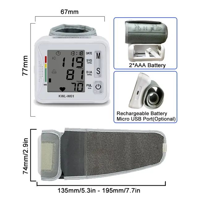 Measurement range: blood pressure 0~280mmHg pulse 40~199 times / min Wrist Type with the bandAccurate results Micro USB port