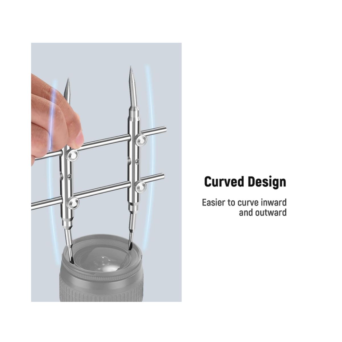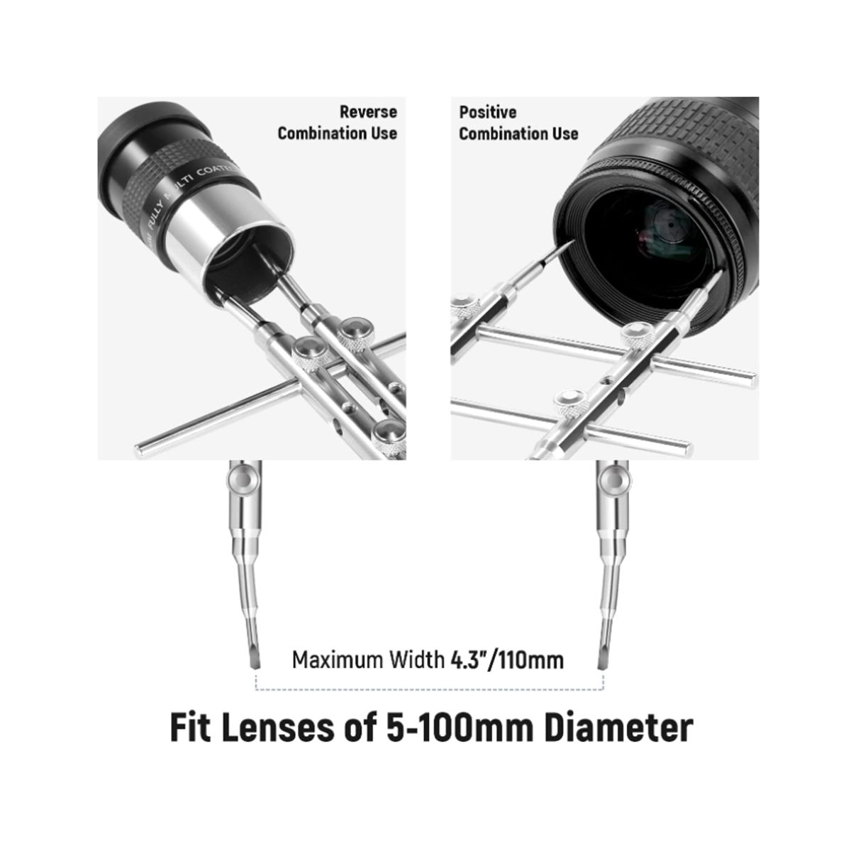 This lens wrench has a pointed and flat end that fits into the standard hole notches and notches on the lens retaining ring respectively. Four screws are included to securely lock the arm and rail for extra stability