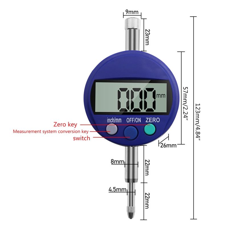 Features: OOTDTY Switchable between millimeters and inches for a variety of precise measurements. Measuring Range from 0 ~ 12.7 mm , High Resolution up to 0.01 mm (0.0005"). Perfect for using in mechanical, industrial procees and laboratory. Made of high quty ABS, aluminum alloy & , durable, sturdy & long time service. Compact and sturdy structure, quickly display measured values on large LCD screen. Specifications: Material: ABS+Aluminum Alloy+ Length: approx 12.3cm/4.3in Measuring range: 0-12.7mm Resolution: 0.01mm Working temperature: 0-40℃ Storage & transportation temperature: -20~70℃ Relative humidity: equal or le than 80% Note: 1. The movement speed of indicator measuring rod shall not be greater than 0.5m /s. 2. The indicator is a precision measuring tool, which should be prevented from hitting and falling to avoid lo of accuracy. 3, should keep clean, avoid water and other liquid substances into the indicator table so as not to affect the normal use. 4, do not use the data output port, do not take off the output cover, do not use metal devices arbitrarily touch the output end, so as not to damage the electronic circuit. 5, indicating any part of the table can not apply voltage, do not use a pen- to write, so as not to damage the electronic circuit. 6. Remove the battery when not in use for a long time. Package Includes: 1x Digital Dial Indicator Note: Please allow 1-3cm error due to manual measurement. pls make sure you do not mind before you bid. Due to the difference between different monitors, the picture may not reflect the actual color of the item.