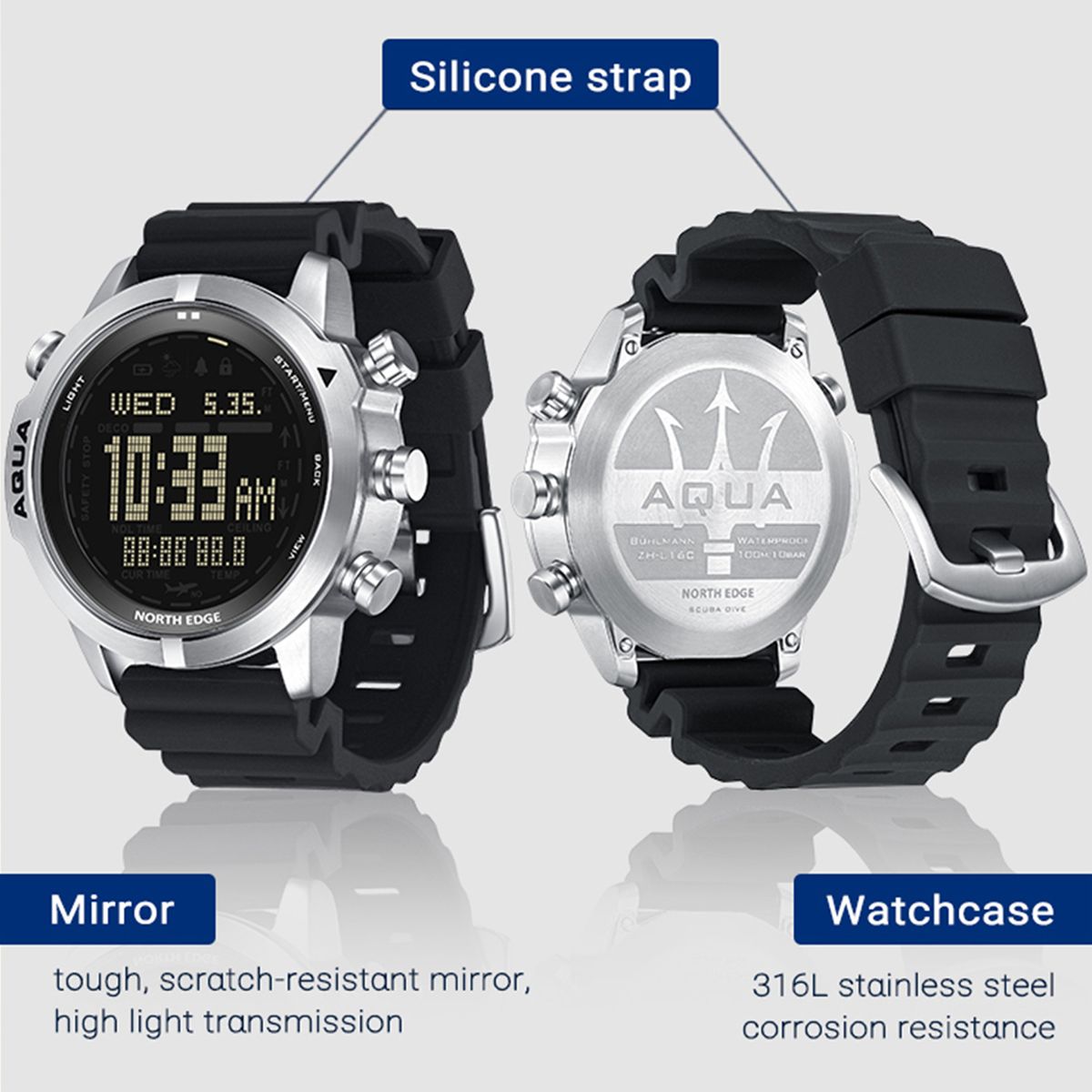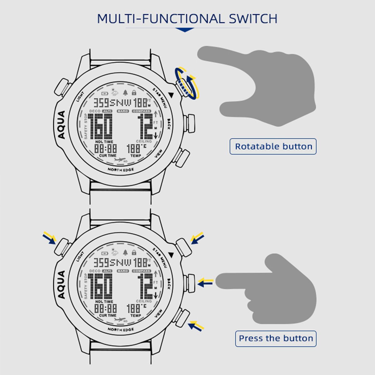 Multifunctional: Scuba Diving, NDL Time, Nitrox, Compass, Altimeter, Barometer, Thermometer, Time, Stopwatch, Count Down, Alarm, Back light, 100M water proof and so on.