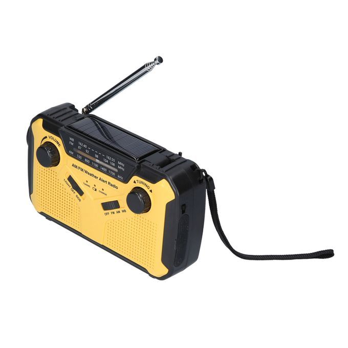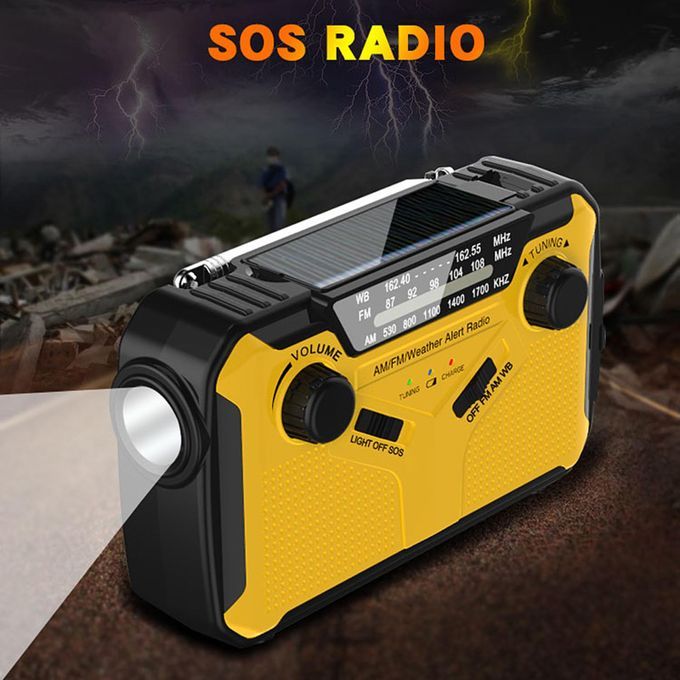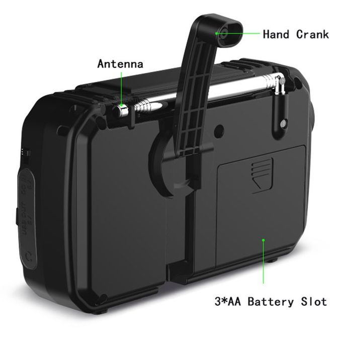 The radio receives AM, FM and WB bands so you can listen to radio, weather, and news at home or anywhere. With USB output, it can be used as an emergency source to supply for smart devices. 4 modes of supply, including AA batteries powered, hand-crank generation, solar and 5V input. This portable radio is designed to work as an emergency radio with SOS alarm and LED flashlight. With volume and tune rotary knobs, AM/FM/WB switch buttons, it is easy and convenient to use.