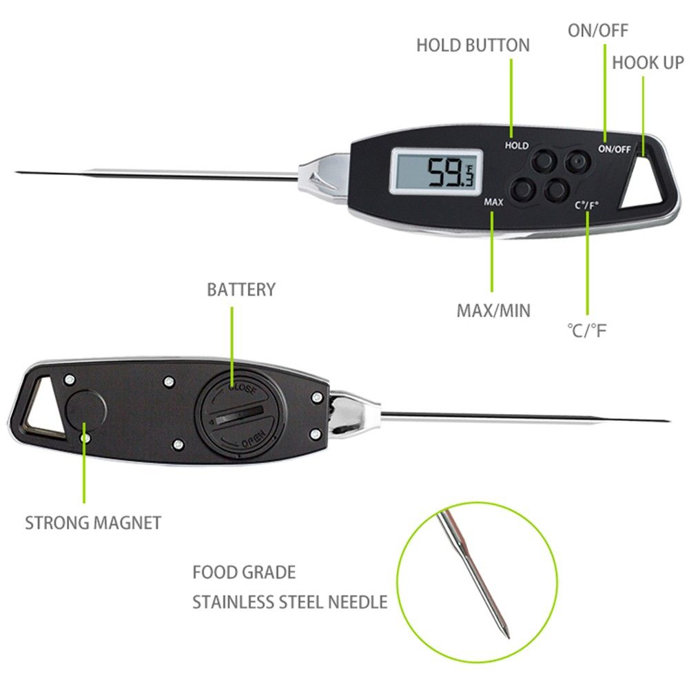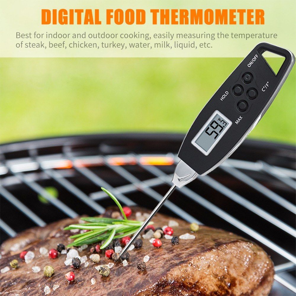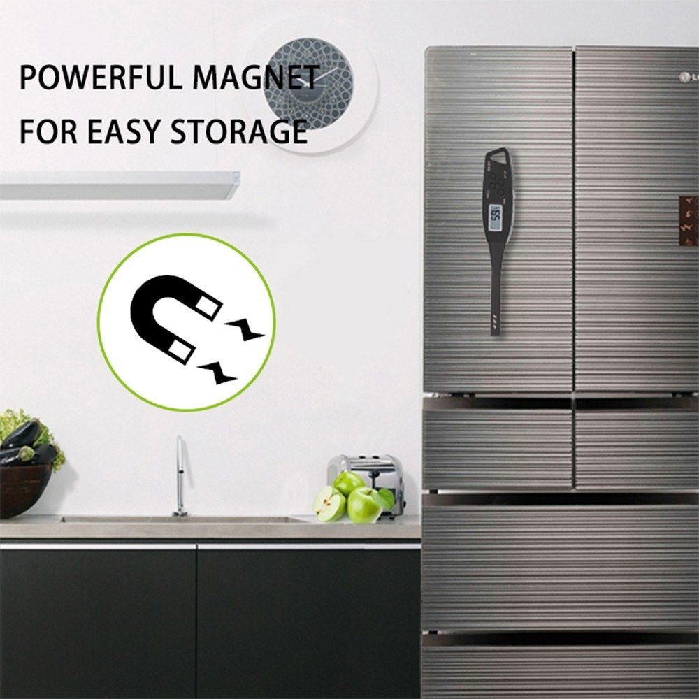 Made of food-grade 304 stainless steel and sturdy ABS, long probe keeps you from burning your hands while measuring. Thermometer with back magnetic and hanging hole makes this food thermometer much easier to carry or store. Best for indoor and outdoor cooking, easily measuring the temperature of steak, beef, chicken, turkey, water, milk, liquid, etc.