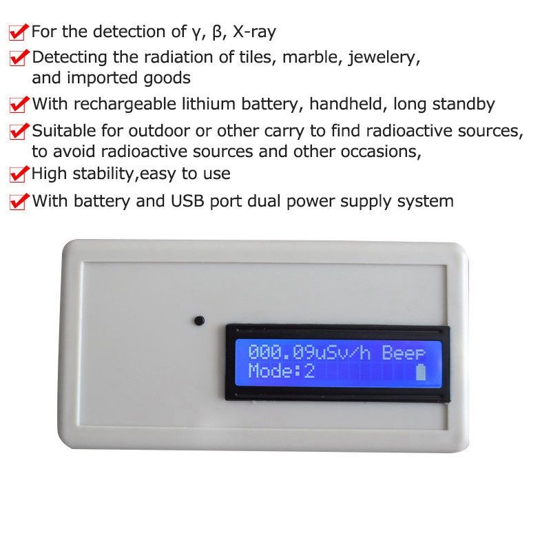 Description: PINTUDY Digital Geiger Counter Nuclear Radiation Detector Beta Gamma X-Ray Meter Tester Analyzers Measurement Instruments 2019 Uses: suitable for indoor and outdoor or other carry to find radioactive sources; nuclear radiation detection; mining exploration; radiation measuring instrument; Avoid radioactive sources; detection of nuclear radiation intensity; radioactive radiation measurement of marble; Individual dose uranium and other radiation measurement and so on. Features: operation is very simple, a on to achieve a variety of work mode transformation handheld instrument design, built-in high-performance battery, suitable for outdoor carry The G-M counter is compensated and the energy response is improved detection of high sensitivity, especially for envmental radioactive monitoring and detection of micro-nuclear radiation Built-in probe type, effective protection of the probe is not damaged keep the count sound, can quickly determine the surrounding envment of the radiation, the rapid positioning of the exact location of the radiation source anti-interference ability, in the complex electromagnetic envment can work reliably instrument display accuracy up to 0.01μSv / h (CPM mode up to 1CPM) widely used, can be used for home envment, daily neceities, mineral rock, decorative stone and other radioactive detection can also be used for industrial or medical imaging equipment, radioactive leakage detection profeional company design can give buyers a strong support Each instrument is calibrated with a source to ensure accurate and reliable measurement results The sale of radiation equipment to provide an annual free calibration service The Contrast of GMV2 and GMJ3 : GMV2 accuracy is industrial grade, J3 precision is the level of scientific research. V2 cover leather tube is built-in, J3 cover leather tube is an external split (split to facilitate the detection of holes or pit) The sensitivity J3 is higher than V2: J3 detects that the volume of the cover grid is larger than V2 (the volume of the cover grid is J3 is four times the volume of V2), so the radiation is paed through the volume, so the time ratio of the accurate radiation V2 is short, so the radiation value is smaller, the data is more smooth and stable. V2 accuracy of up to 0.02usv / h, is very high accuracy. J3 precision up to 0.01usv / h, is the highest accuracy. Selection Guide: Model: GMJ3 Host volume: 135 * 70 * 25mm Split cover leather tube volume: length 22cm, diameter 2.6cm Product weight: 240g 14500 lithium battery (1200mah) Uses: carry, industrial, home, strong radioactive research, medical use, can detect Xγβ ray Note: Please allow minor errors due to manual measurement. Item color displayed in photos may be showing slightly different since monitors are not calibrated same. Package Contents: 1pc ofHost