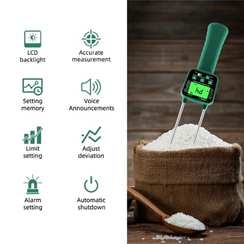 Smart Sensor Moisture meters are used to measure the percentage of water in a given substance. This information can be used to determine if the material is ready for use, unexpectedly wet or dry, or otherwise in need of further inspection. Grain Can Be Measured: rapeseed, sesame, soybean meal, cotton, soybean, peanut,barley, rice, sorghum, watermelon seed, paddy, wheat, maize, fodder