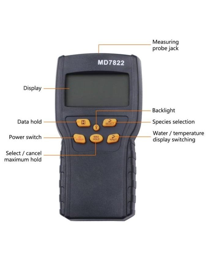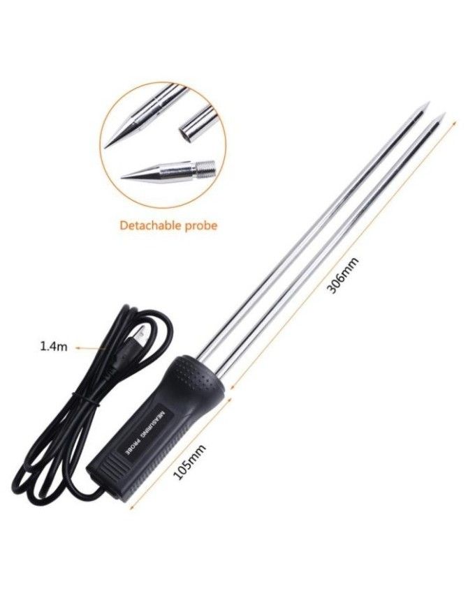 Moisture measuring range: 2% to 30%Maximum error : ± (1%Rh +0.5)Resolution: 0.5%Temperature measuring range: - 10°C to 60°CMaximum error: ±2°C(±4°F)Resolution: 1°C /2°FEnvironment: Ambient temperature: - 10°C to 40°CAmbient humidity: 0~70%RHWeight:460gDimension: 170*170*50mm (main unit)440*60*60mm (measurement probe)